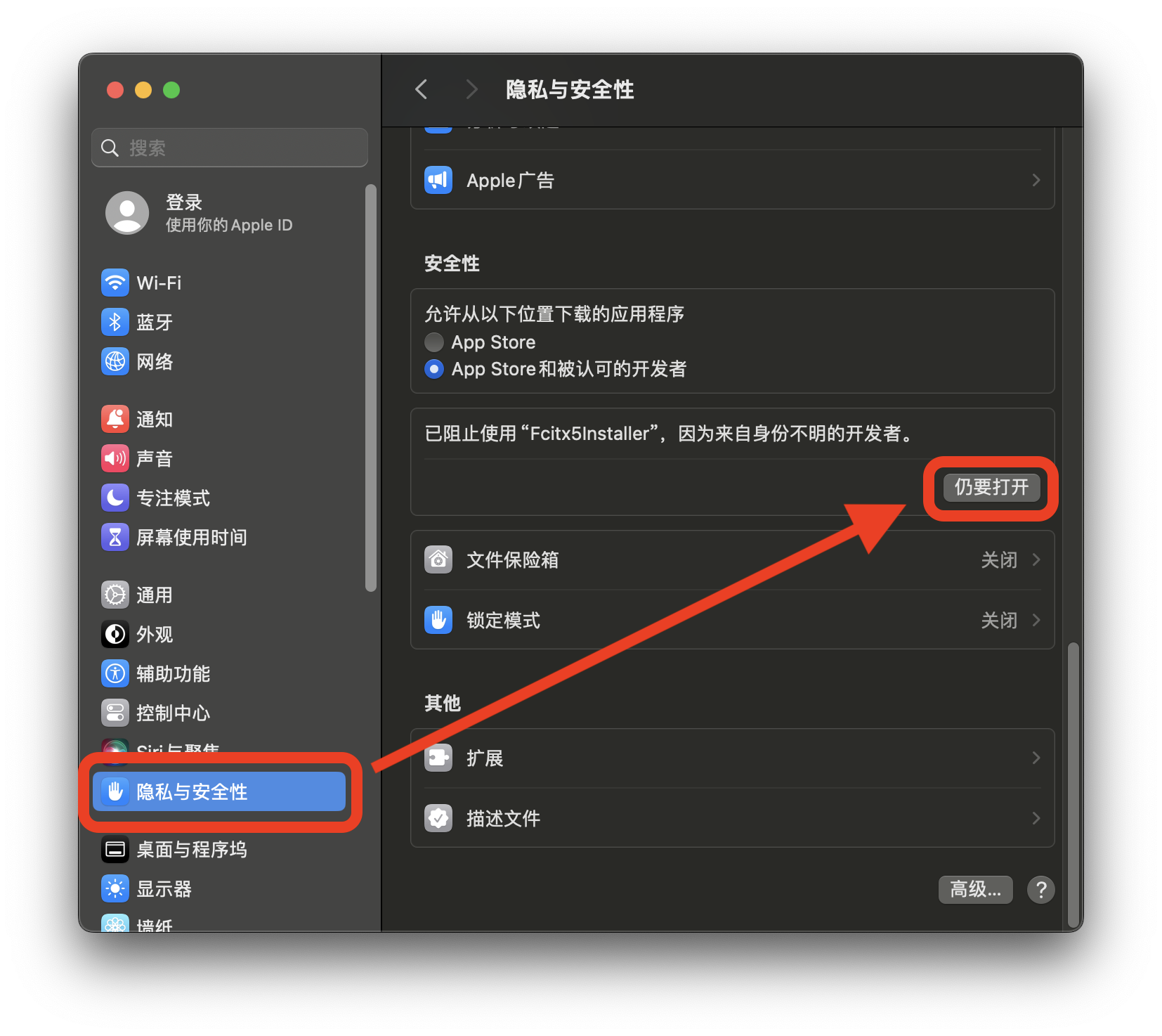 系统设置 -> 隐私与安全性 -> 仍要打开